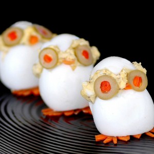 En primer lugar, cortamos las aceitunas en rodajas: cada una de ellas será un ojo. Las colocamos presionando suavemente contra el relleno. Para los pies, cortamos una rodaja fina de zanahoria y cortamos los deditos con un cuchillo. El pico podemos hacerlo con un poquito de pimiento rojo o con un trocito de zanahoria.