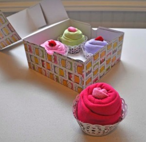 PASO 3: Coloca un calcetín en una de las puntas del body. Deja sobresalir el calcetín y enrolla el body alrededor de éste. Coloca una goma elástica en la parte inferior para que no se deshaga el cupcake.