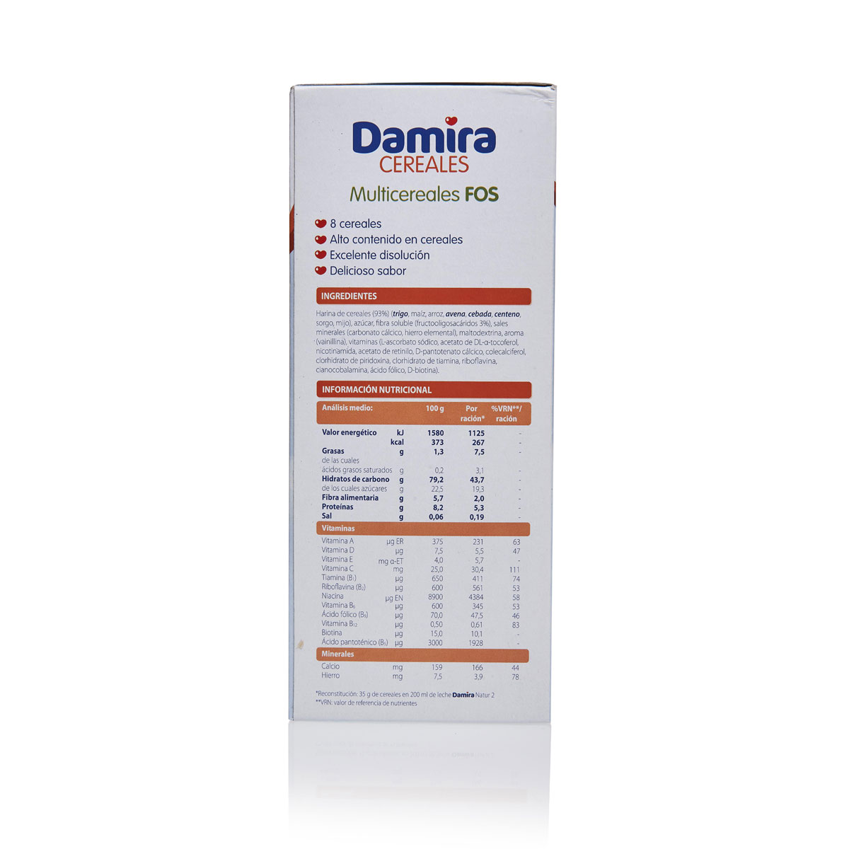 Harina de cereales (93%) (trigo, maíz, arroz, avena, cebada, centeno, triticale, espelta), azúcar, fibra soluble (fructooligosacáridos 3%), sales minerales (carbonato cálcico, hierro elemental), maltodextrina, aroma (vainillina), vitaminas (L-ascorbato sódico, acetato de DL-α-tocoferol, nicotinamida, acetato de retinilo, D-pantotenato cálcico, colecalciferol, clorhidrato de piridoxina, clorhidrato de tiamina, riboflavina, cianocobalamina, ácido fólico, D-biotina).