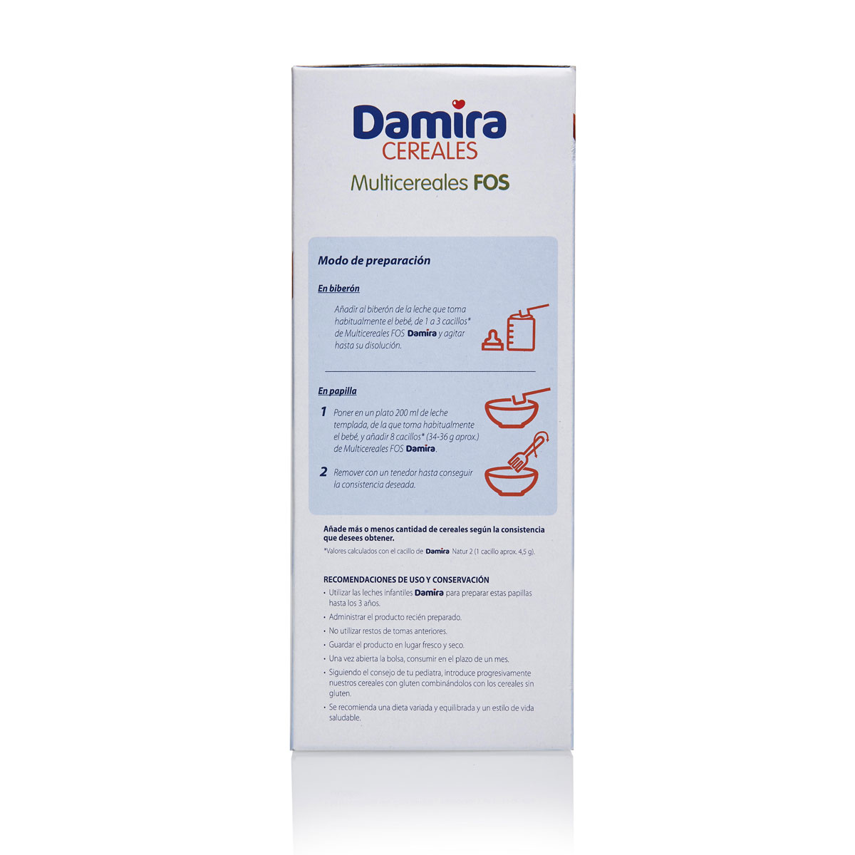 Añadir al biberón de la leche que toma habitualmente el bebé, de 1 a 3 cacillos* de Multicereales FOS y agitar hasta su disolución.