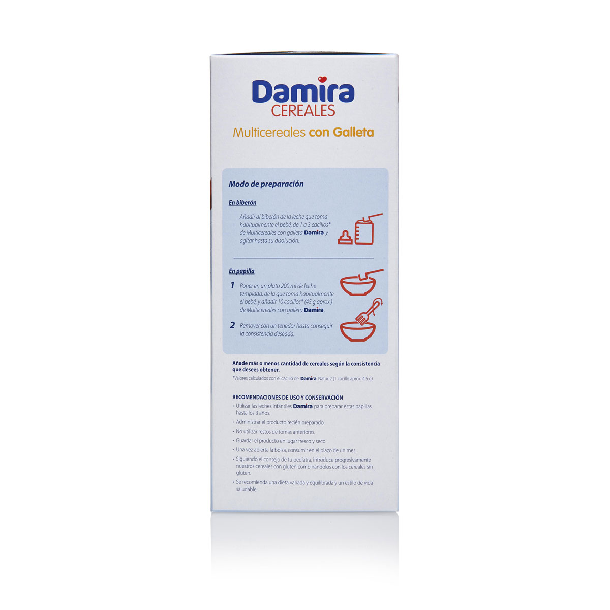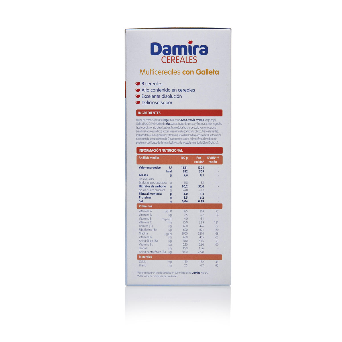 Harina de cereales (81,5%) (trigo, maíz, arroz, avena, cebada, centeno, triticale, espelta), Galleta María (14%) (harina de trigo, azúcar, jarabe de glucosa y fructosa, aceite de girasol alto oleico, sal, gasificante (bicarbonato de sodio y amonio), aroma (vainillina), ácido ascórbico), azúcar, sales minerales (carbonato cálcico, hierro elemental), maltodextrina, aroma (vainillina), vitaminas (L-ascorbato sódico, acetato de DL-α-tocoferol, nicotinamida, acetato de retinilo, D-pantotenato cálcico, colecalciferol, clorhidrato de piridoxina, clorhidrato de tiamina, riboflavina, cianocobalamina, ácido fólico, D-biotina).