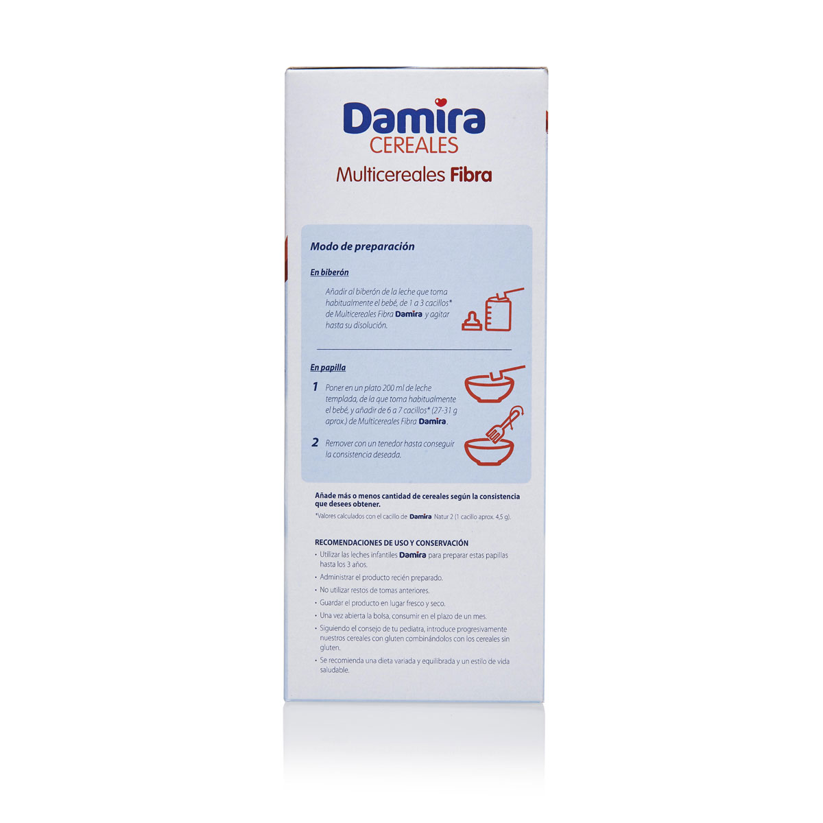 Añadir al biberón de la leche que toma habitualmente el bebé, de 1 a 3 cacillos* de Multicereales Fibra y agitar hasta su disolución.