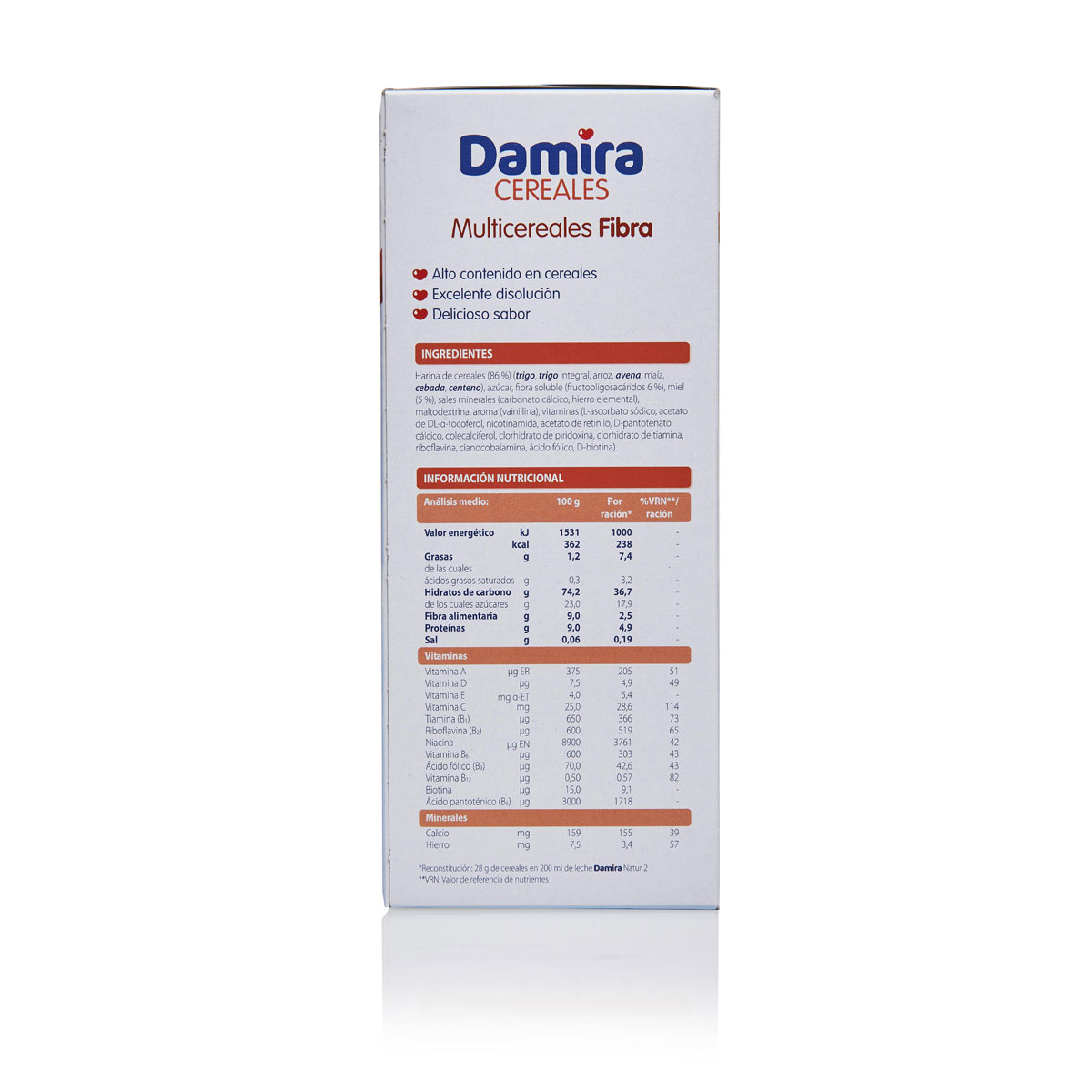 Harina de cereales (86%) (trigo, trigo integral, arroz, avena, maíz, cebada, centeno), azúcar, fibra soluble (fructooligosacáridos 6%), miel (5%), sales minerales (carbonato cálcico, hierro elemental), maltodextrina, aroma (vainillina), vitaminas (L-ascorbato sódico, acetato de DL-α-tocoferol, nicotinamida, acetato de retinilo, D-pantotenato cálcico, colecalciferol, clorhidrato de piridoxina, clorhidrato de tiamina, riboflavina, cianocobalamina, ácido fólico, D-biotina).
