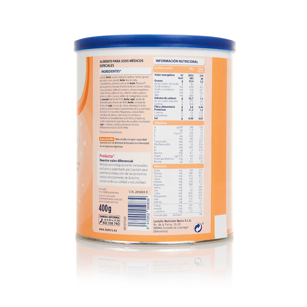 Lactosa (leche), aceites vegetales (palma, nabina, girasol alto oleico, coco, girasol), leche descremada, maltodextrinas, proteínas séricas de leche (Prolacta®), goma garrofín, minerales (fosfato tricálcico, cloruro sódico, cloruro potásico, hidróxido potásico, cloruro magnésico, sulfato ferroso, sulfato de zinc, selenito sódico, yoduro potásico, sulfato cúprico, sulfato de manganeso), aceite de pescado (fuente de DHA) (leche, soja), aceite de Mortierella alpina (fuente de ARA) (leche), emulgente (lecitina de soja), cloruro de colina, vitaminas (L-ácido ascórbico, nicotinamida, D-pantotenato cálcico, palmitato de retinol, DL-a-tocoferol, filoquinona, colecalciferol, clorhidrato de tiamina, clorhidrato de piridoxina, riboflavina, cianocobalamina, ácido fólico, D-biotina), inositol, antioxidantes (palmitato de ascorbilo, tocoferoles) (soja), L-cisteína, L-carnitina, fermentos lácteos (Bifidobacterium lactis CNCMI-3446).